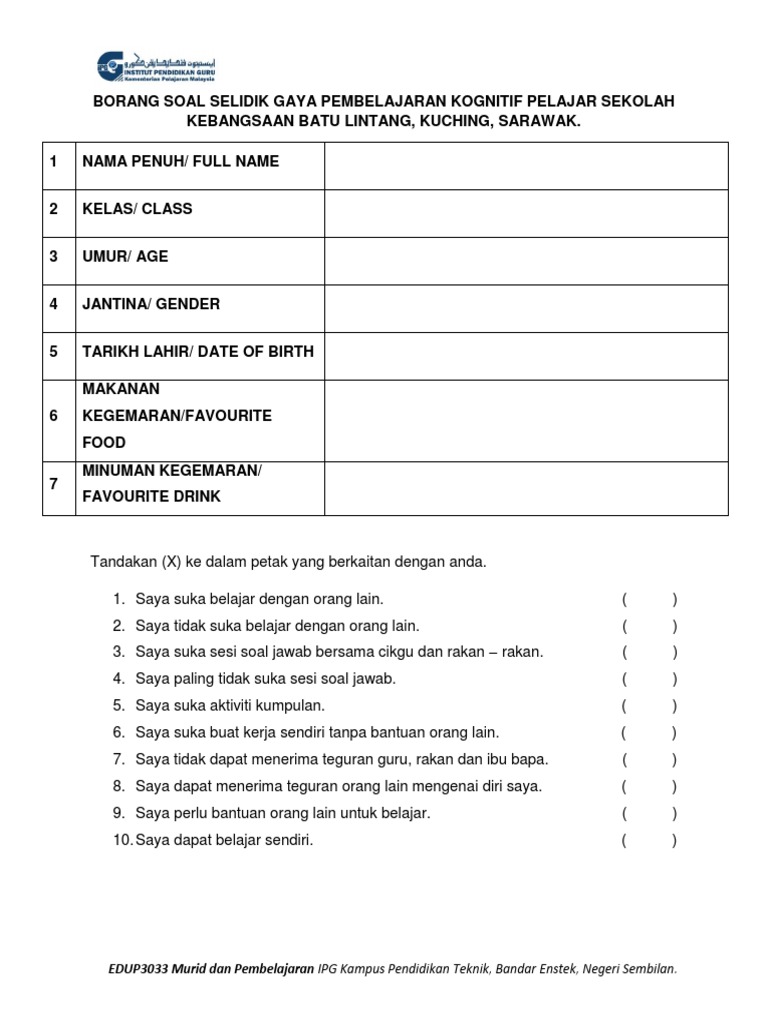 Borang Soal Selidik Gaya Pembelajaran Kognitif Pdf