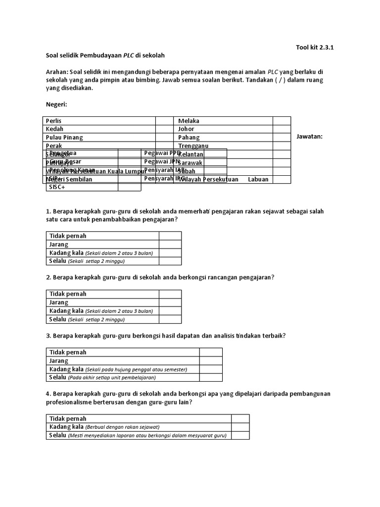 Tool Kit 2 3 1 Soal Selidik Pembudayaan Plc Di Sekolah Pdf